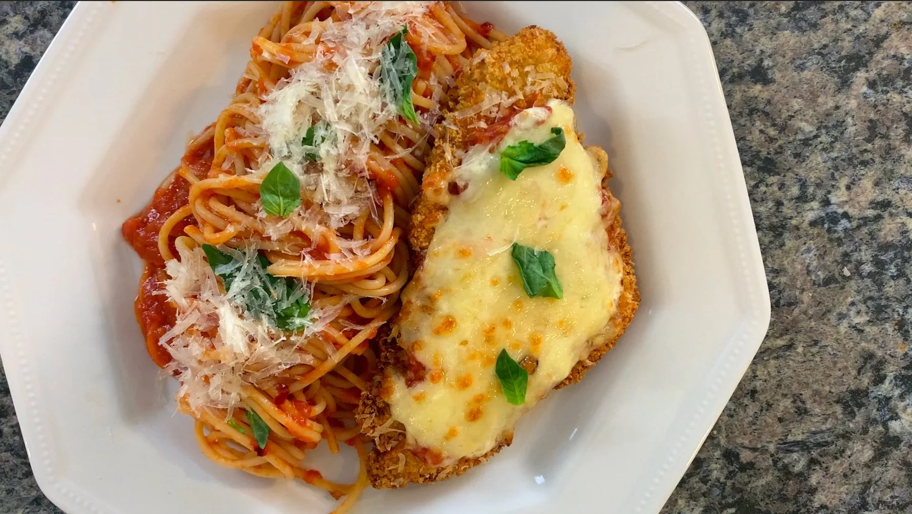 - Serve pasta in a bowl or plate and serve with the freshly baked chicken parmesan with a garnish of basil and extra parmesan