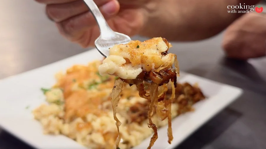 In addition, this dish is different from mac and cheese because a key characteristic is the caramelized onions, which isn’t really found in an American mac and cheese.