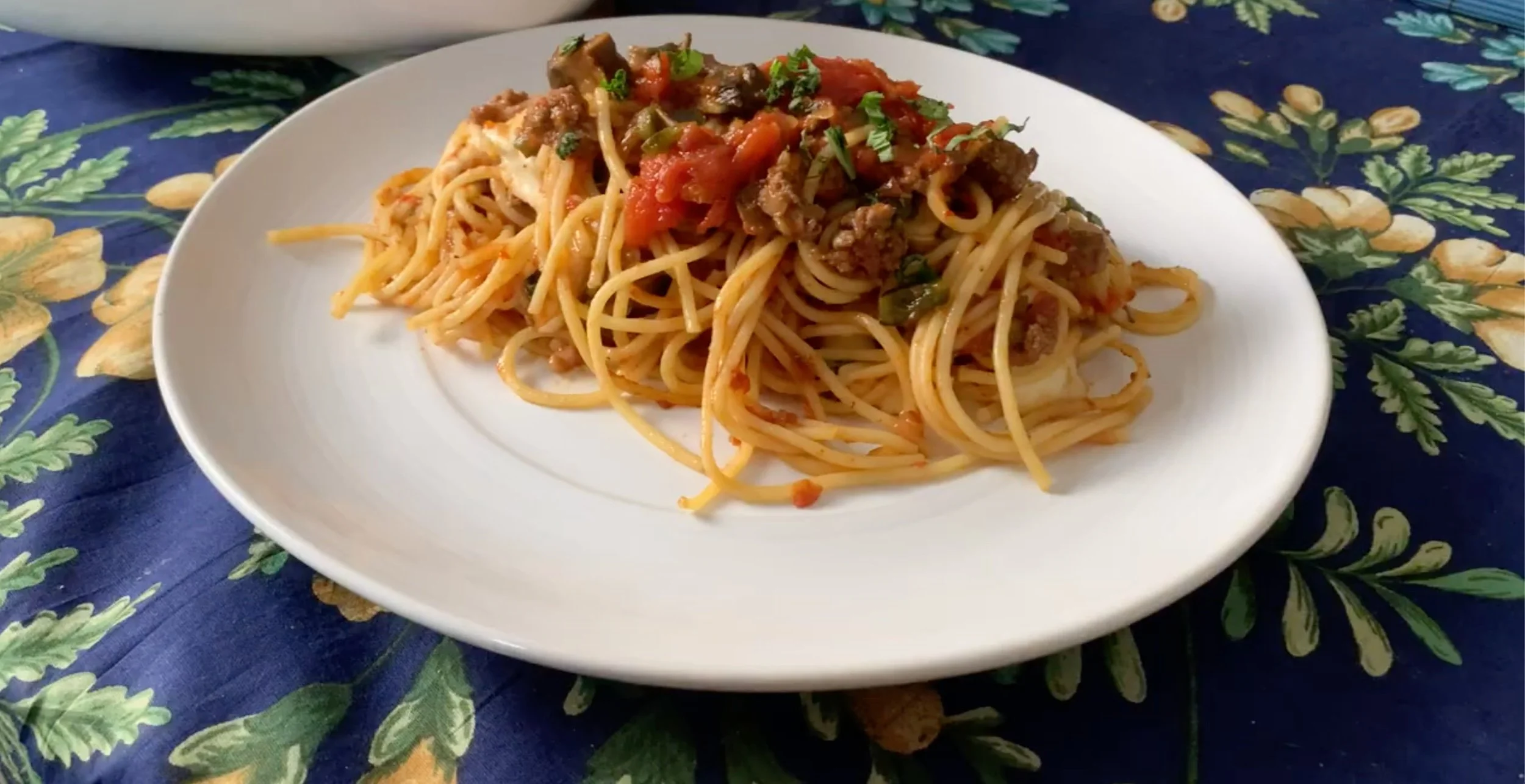 This meaty and cheesy baked spaghetti recipe has everything to make this a comforting meal! A hearty meat sauce made with ground beef, peppers, onions and mushrooms, paired with spaghetti and topped with mozzarella cheese and smoked applewood cheddar!