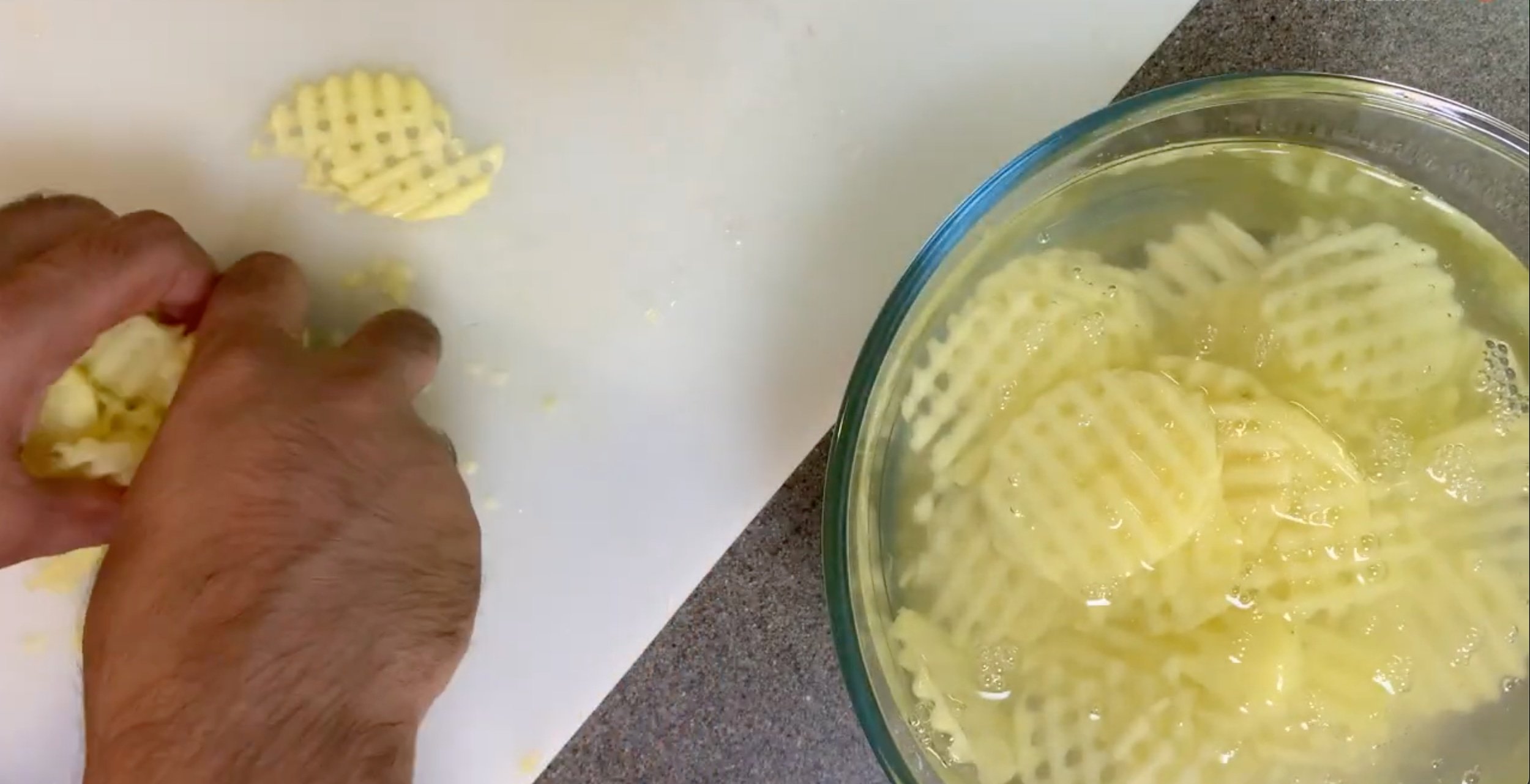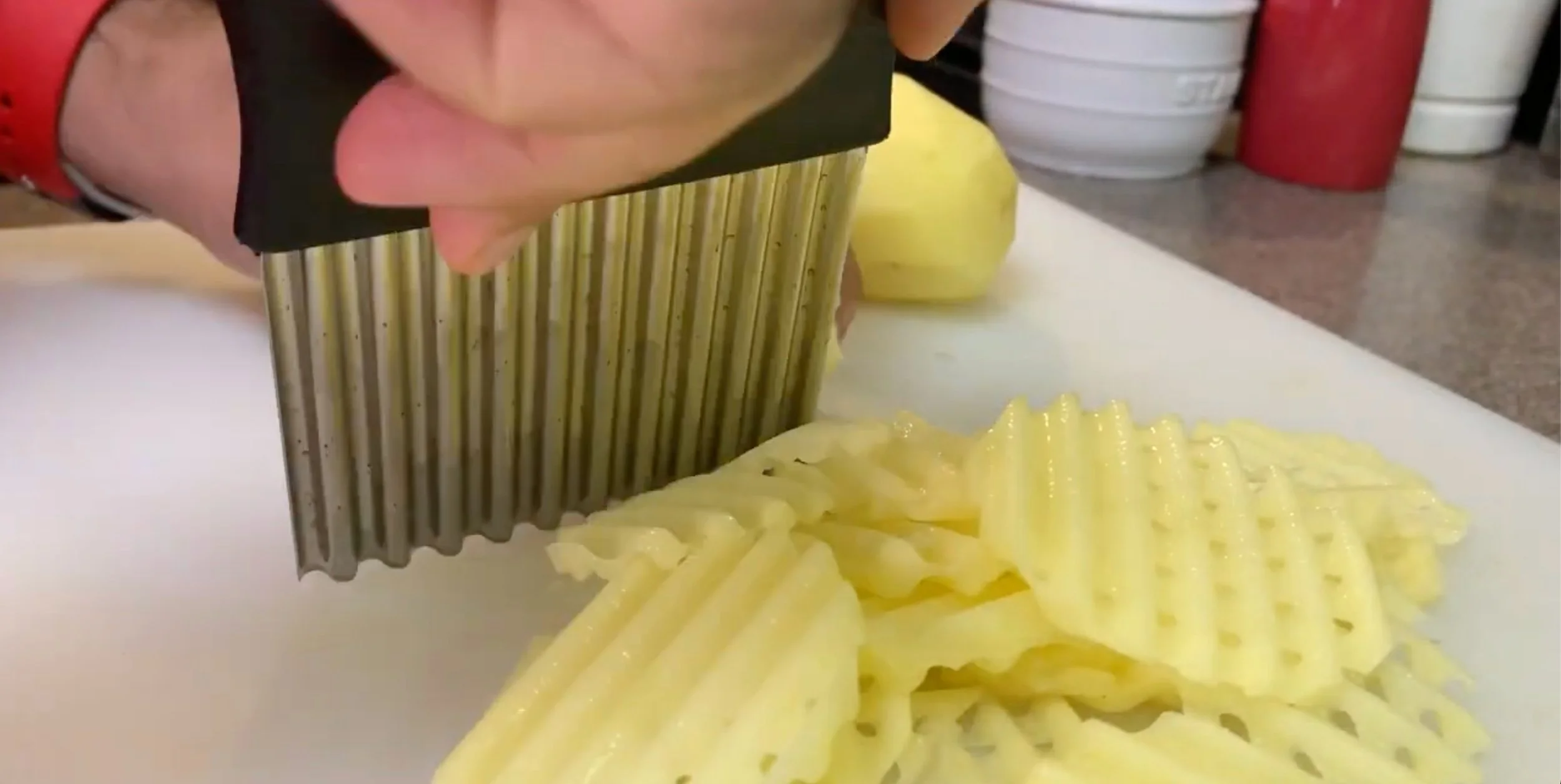 - Place the potato lengthwise on a cutting board and using a crinkle cutter, slice 1 edge of the potato. Then rotate the potato 90 degrees and make another cut with the crinkle cutter to create a cross hatch waffle pattern. Repeat the same for the remaining potatoes.