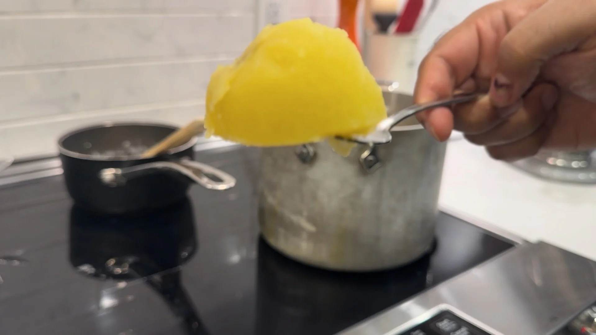 Use Yukon gold potatoes because they are the most “potato-y” of the potatoes! They’re waxy and creamy, and they’ll be the key to achieving the perfect colour for your mashed potatoes.