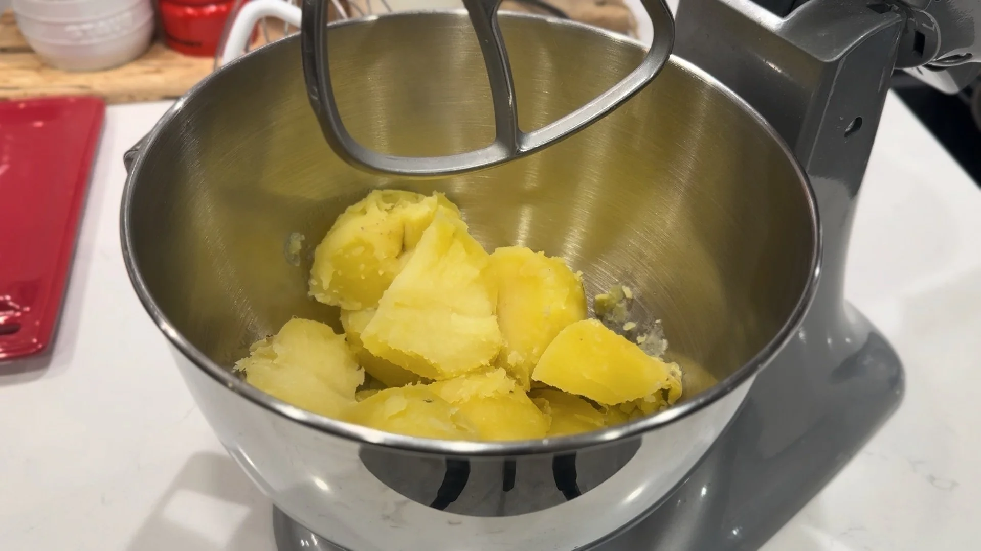 Peel the potatoes while still warm and add to a large bowl or in the bowl of your stand mixture.