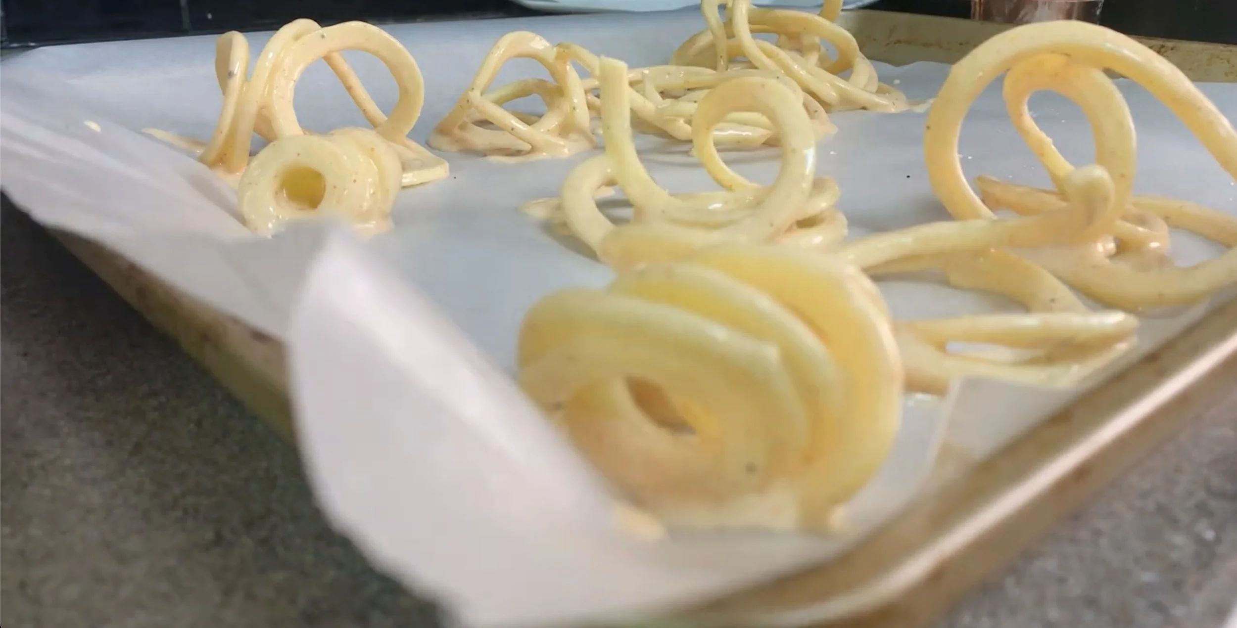 - Drain the fries and then pat them dry. Prepare a large baking sheet with parchment paper. Dip each curly fry and dip in the batter. Let any excess drip away and then place this battered portion on the baking sheet. Repeat the same with the remaining fries.