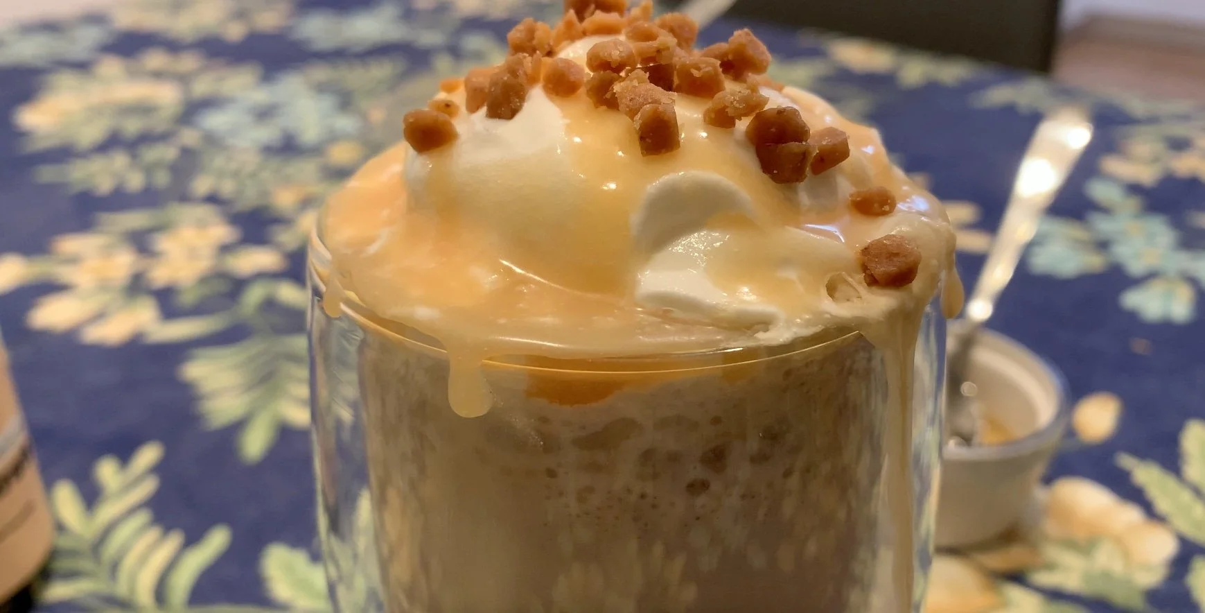 - Pour to serving glass top with whipped cream, toffee bits and caramel sauce.