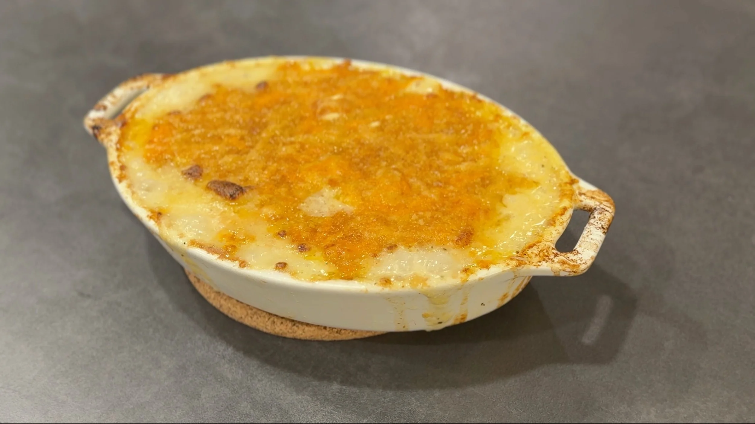 In case the sauce splits or curdles, add some heavy cream, lightly mix together and continue baking.