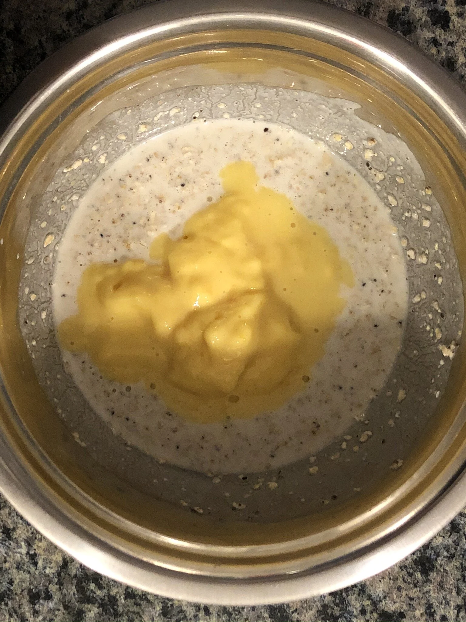 - Add the puree into the bowl with the base for the overnight oats. Combine well using a whisk.