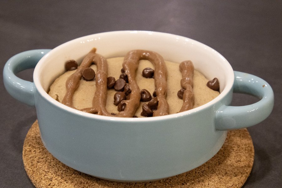 - Grease a oven safe ramekin or bowl with some olive oil and then pour the mixture in. Make sure to fill the bowl/ramekin about 3/4 of the way up. Add half the chocolate chips and loosely mix it around.