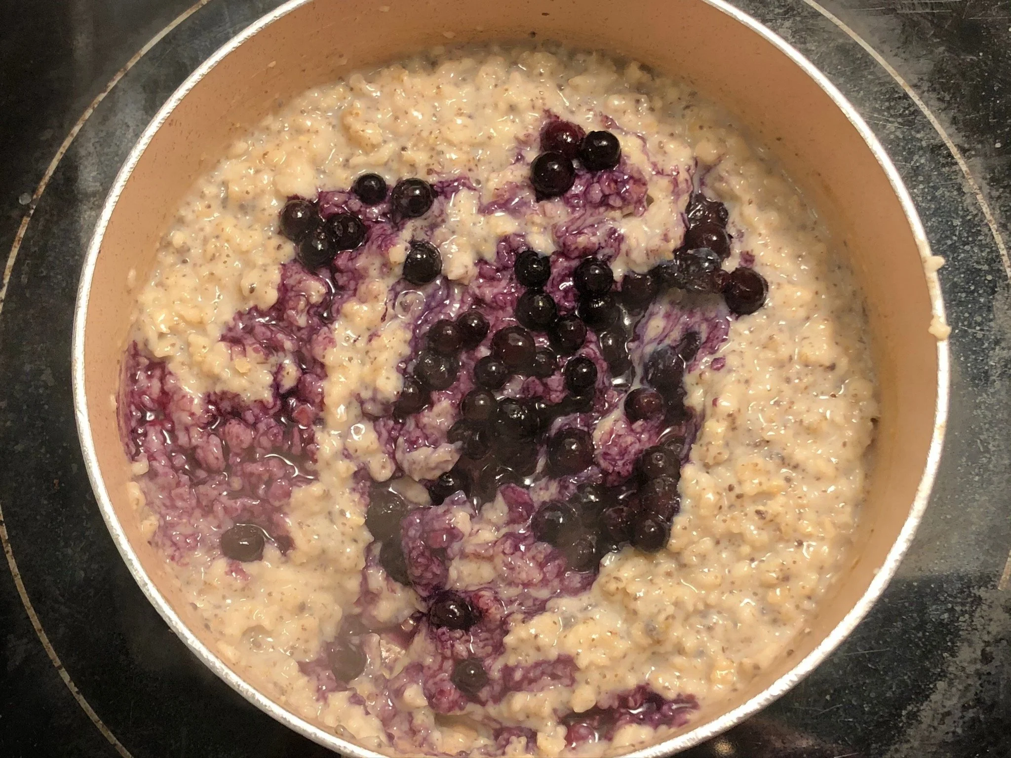 - Continuously stir the mixture until the milk comes up to a simmer. Add in half of the blueberries and stir well to bring the mixture together, adding more milk if necessary to maintain consistency.