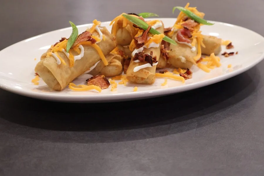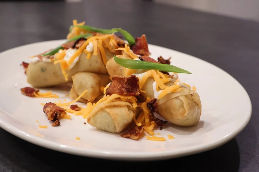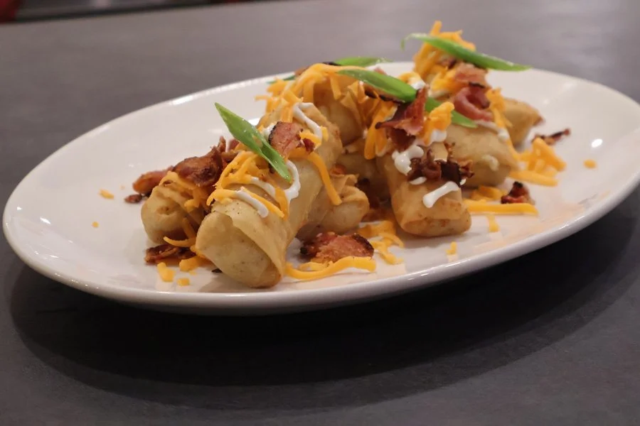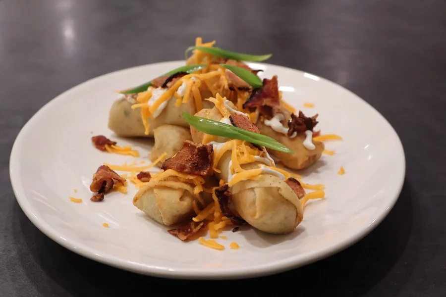 Perfect for a crowd: This was a really hot item at the restaurant, and if you try this at home, I’m sure these spring rolls will fly off the table! What’s not to love? Crispy spring rolls on the outside with a warm and creamy mashed potato filling inside, topped with cheddar, bacon and sour cream. This treat sure is a flavour explosion that will have everyone coming back for a second or third!