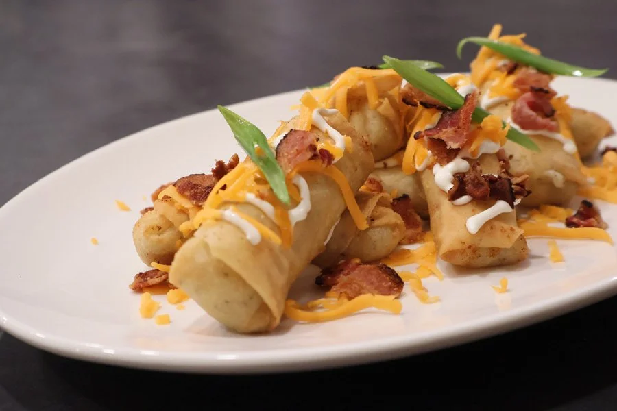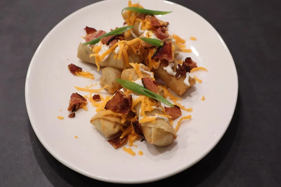 Finally, top with sour cream, cheddar, bacon, and green onions — it’s the little touches that make these spring rolls unforgettable. To go any extra mile, follow my instructions to plate and serve.