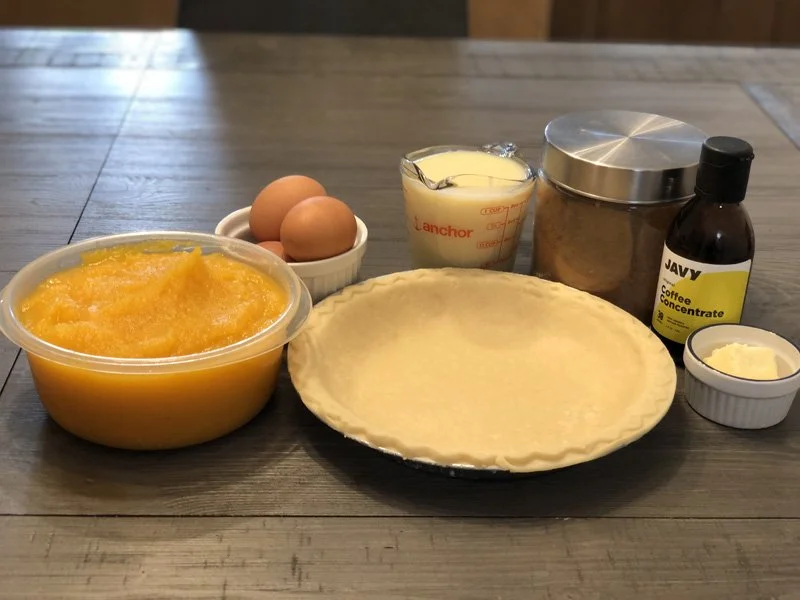 - While the crust bakes, prepare the filling. In a bowl, combine the pumpkin puree, eggs, condensed milk, pumpkin spice and Javy coffee.