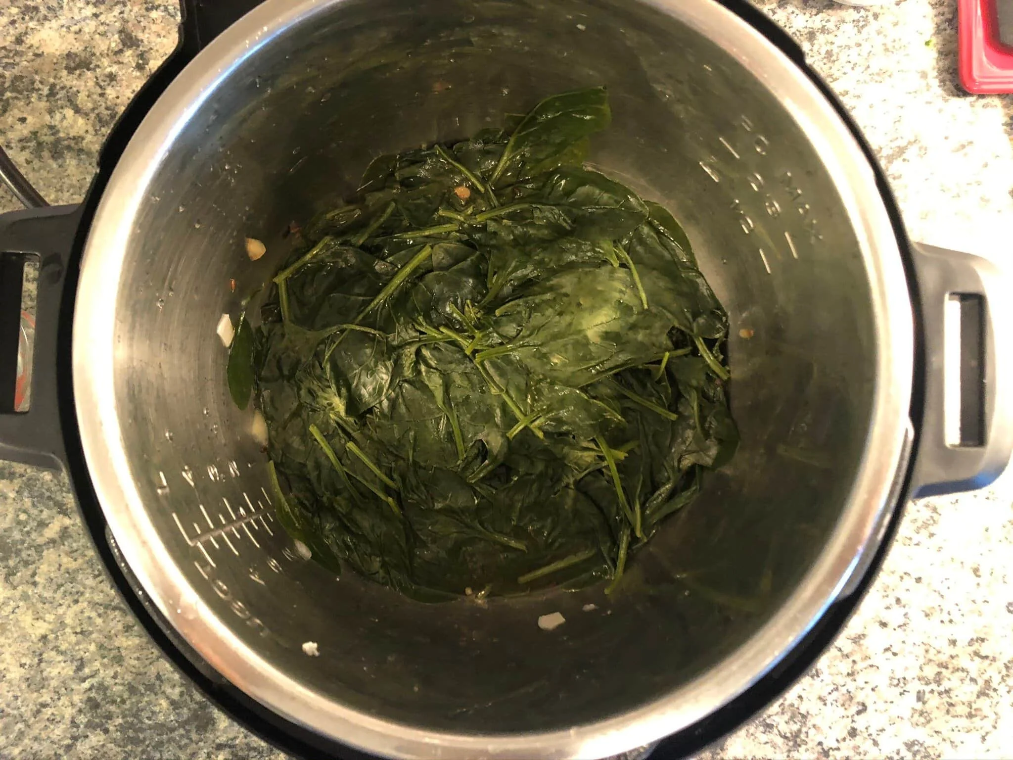 As soon as the Instant Pot pressure cook timer goes off, make sure to carefully turn the valve to release all steam. Otherwise, the spinach will change colour from a bright green.