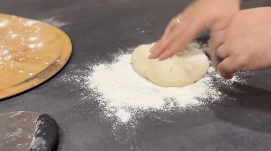 - Dust your countertop with flour and starting with one portion of dough at a time, add the dough ball over the dusting mixture. Starting from the centre of the dough, press down on the dough and create a rim around the side.