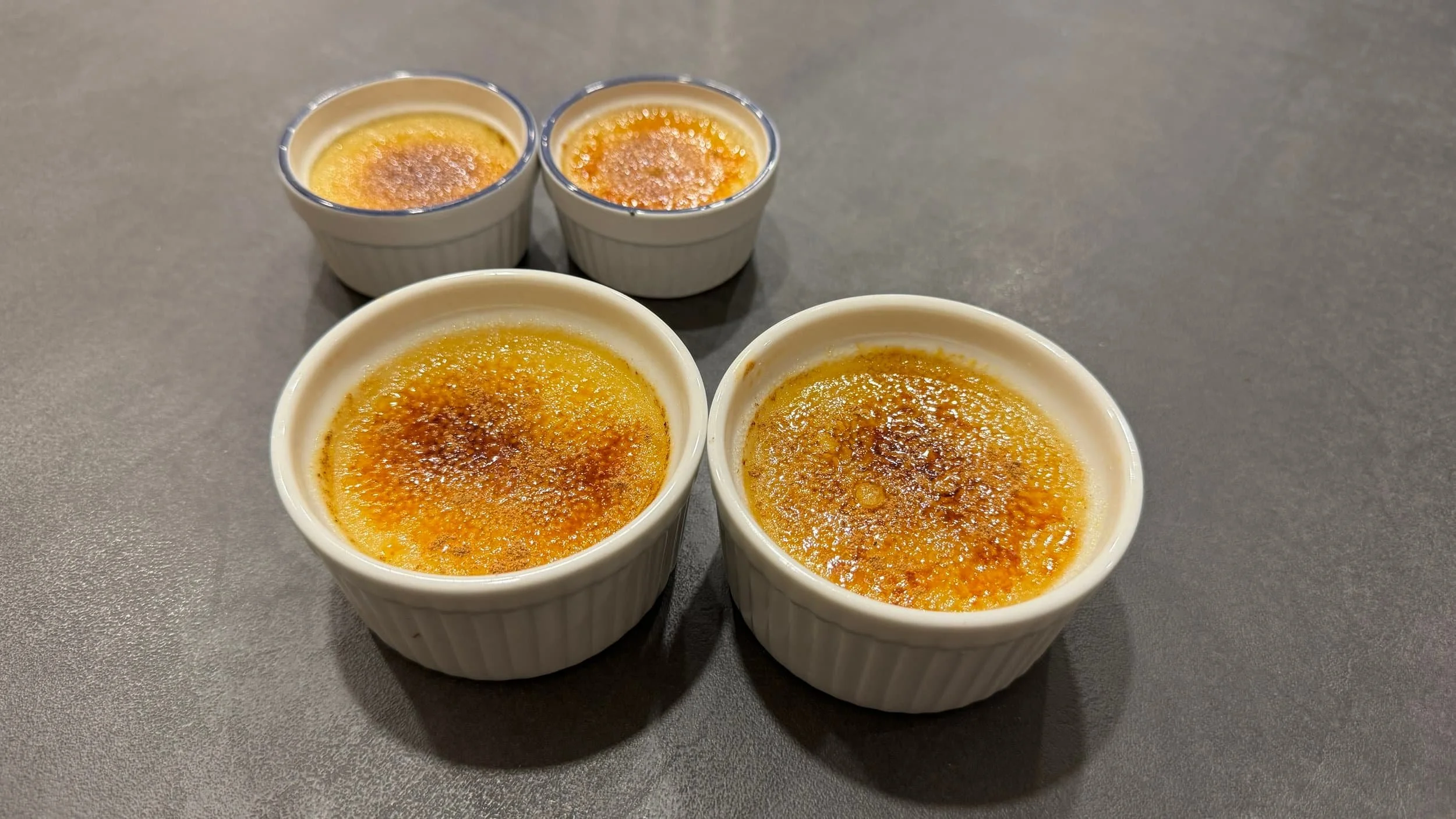 - Just before serving, sprinkle a thin, even layer of granulated sugar over the custard's surface. Use a brush to spread the sugar evenly and then use a kitchen blow torch to brûlée the sugar. Hold the torch away from the ramekins and use the tip of the flame to gently brûlée the sugar until golden brown. Alternatively, you can place the ramekins under a broiler for a few minutes, but be sure to watch them closely to prevent burning.