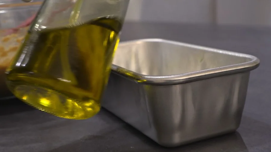 - Preheat the oven to 350F and grease a 9x5 inch loaf pan with olive oil or butter.
