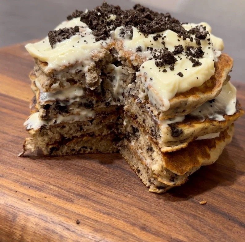 - Stack on another pancake and repeat until you've coated the top pancake with a final layer of cream cheese glaze and crushed Oreos. Serve warm, enjoy!