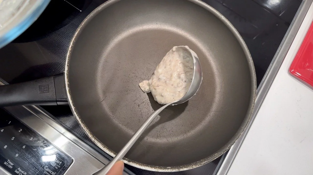 - Heat a non-stick skillet or griddle on medium heat and using a 1/3 cup measuring cup or a ladle, pour the batter onto the centre of the hot pan.