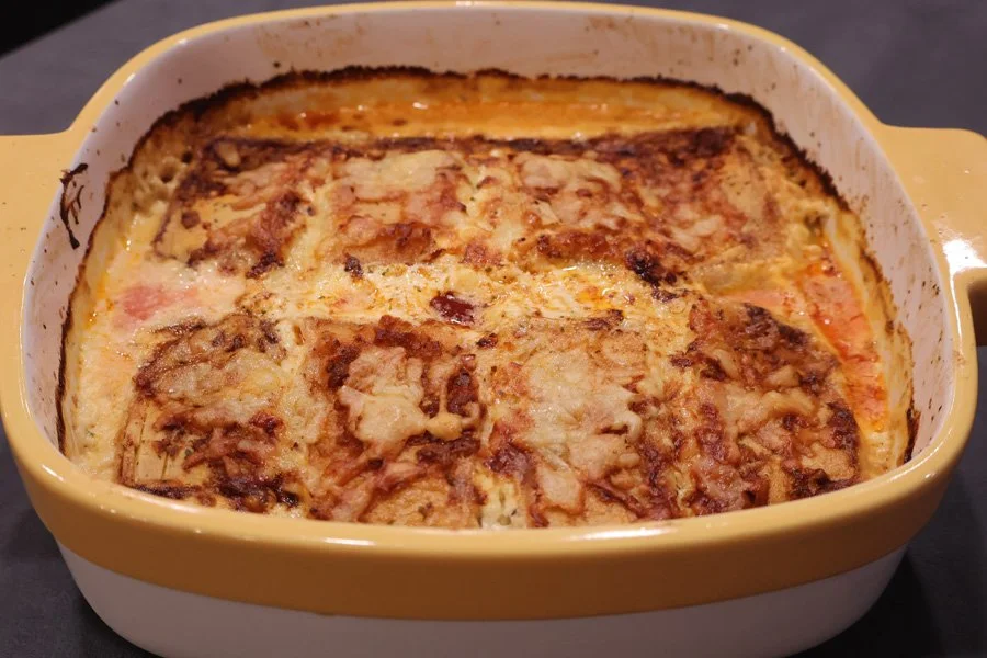 Baked: Arrange the filled pastry in a casserole dish and top with a cream mixture, then bake until the pastry is completely cooked and the top is golden brown.