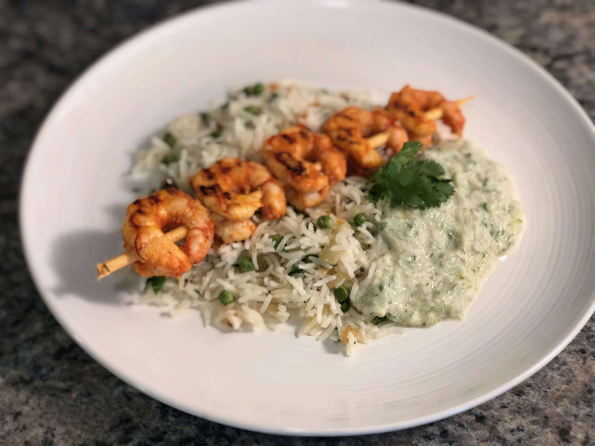 Succulent marinated Grilled Tandoori Shrimp Skewers are so juicy, tender, and full of amazing bold flavours! Paired with a vegetable pulao and cucumber raita, this is a wonderful summer meal!