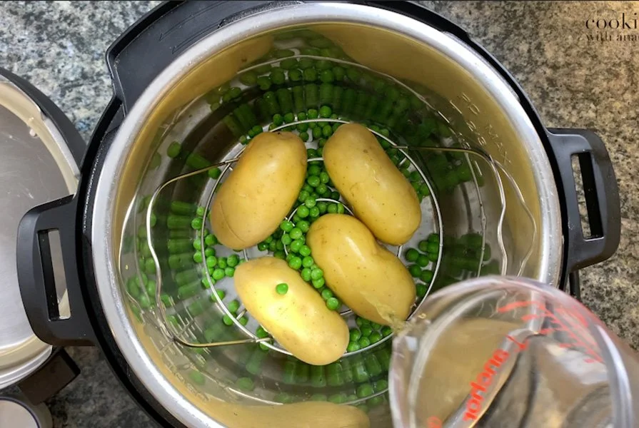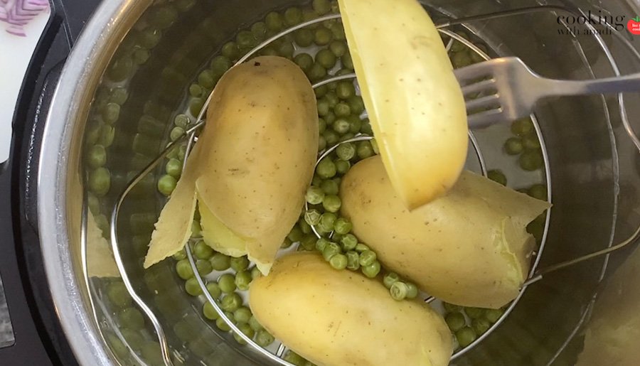 - Boil the potatoes and peas in a pressure cooker. If using an Instant Pot, slice potatoes in half, insert a trivet to the pot and add the potatoes and peas directly on the trivet.