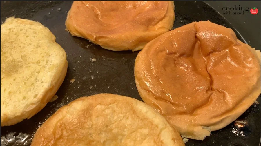 9. Heat a tawa pan on medium low heat and add 1-2 Tbsp of butter and let it melt. Slice the pavs in half and add to the pan. Coat each side with butter, adding more as necessary to complete butter the pav. Toast lightly, until pavs are warmed through.