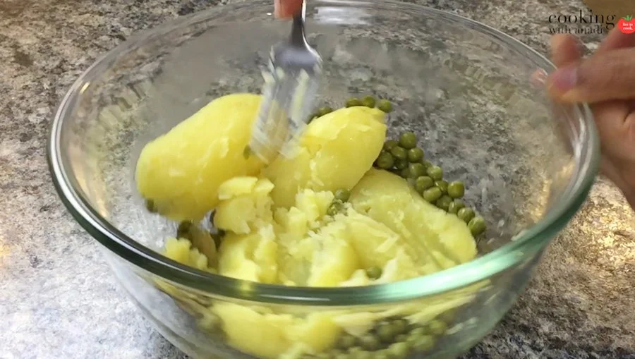 - Peel the potatoes and transfer both potatoes and peas to a large bowl. Lightly mash the potatoes and peas and set aside for use later