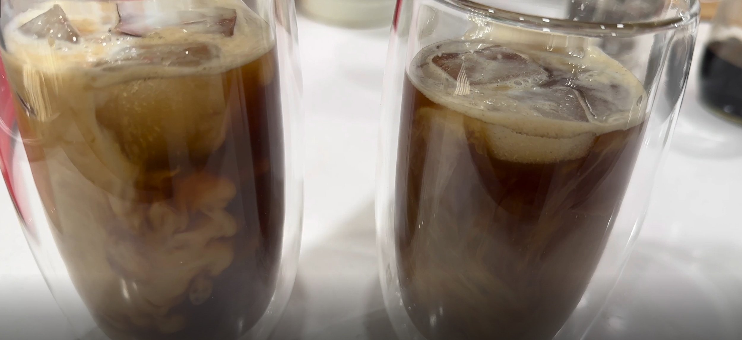 Add ice cubes to the serving glasses and then add the shaken coffee. Top with a couple splashes of milk, or until it is to your preference.
