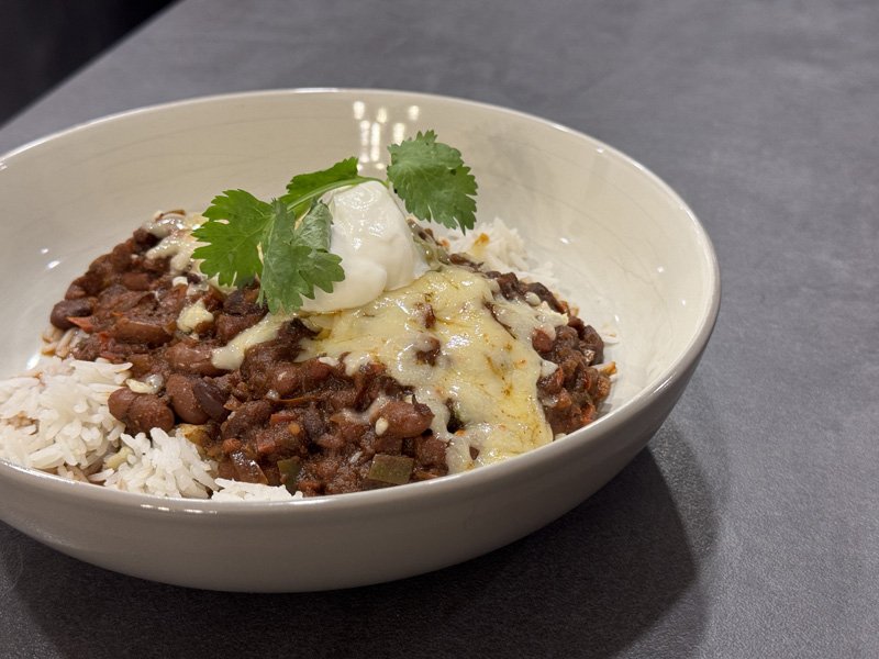Serve the chilli over a warm bed of rice. Top the chili with grated cheddar cheese. Optionally, torch your cheese.