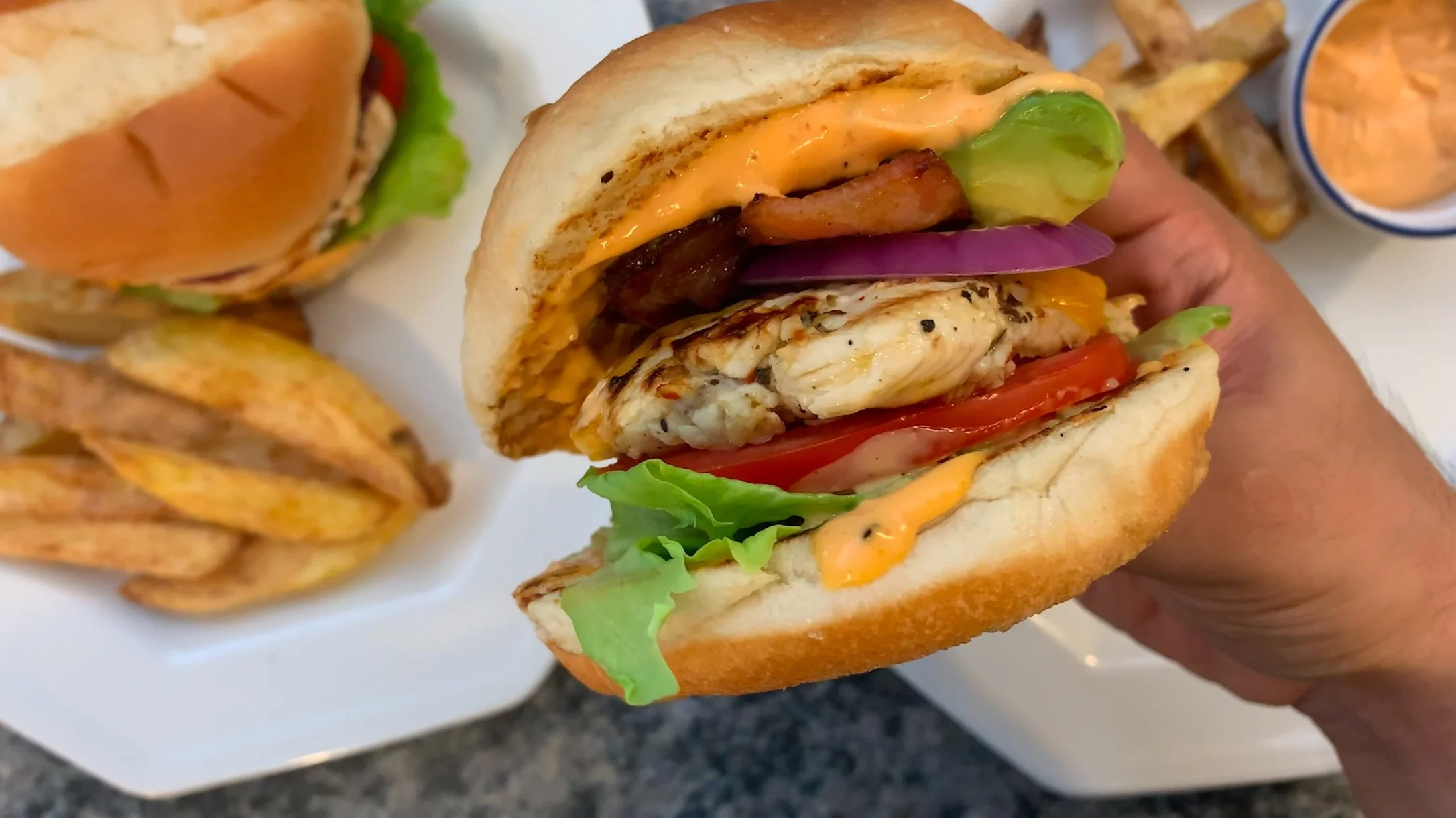 - Spread the spicy mayo on both buns. Add the lettuce and tomato on the bottom bun. Gently place the chicken on top of the tomato. Add the onion rings, the bacon slices, and avocado slices. Add the top bun, serve hot, and enjoy!