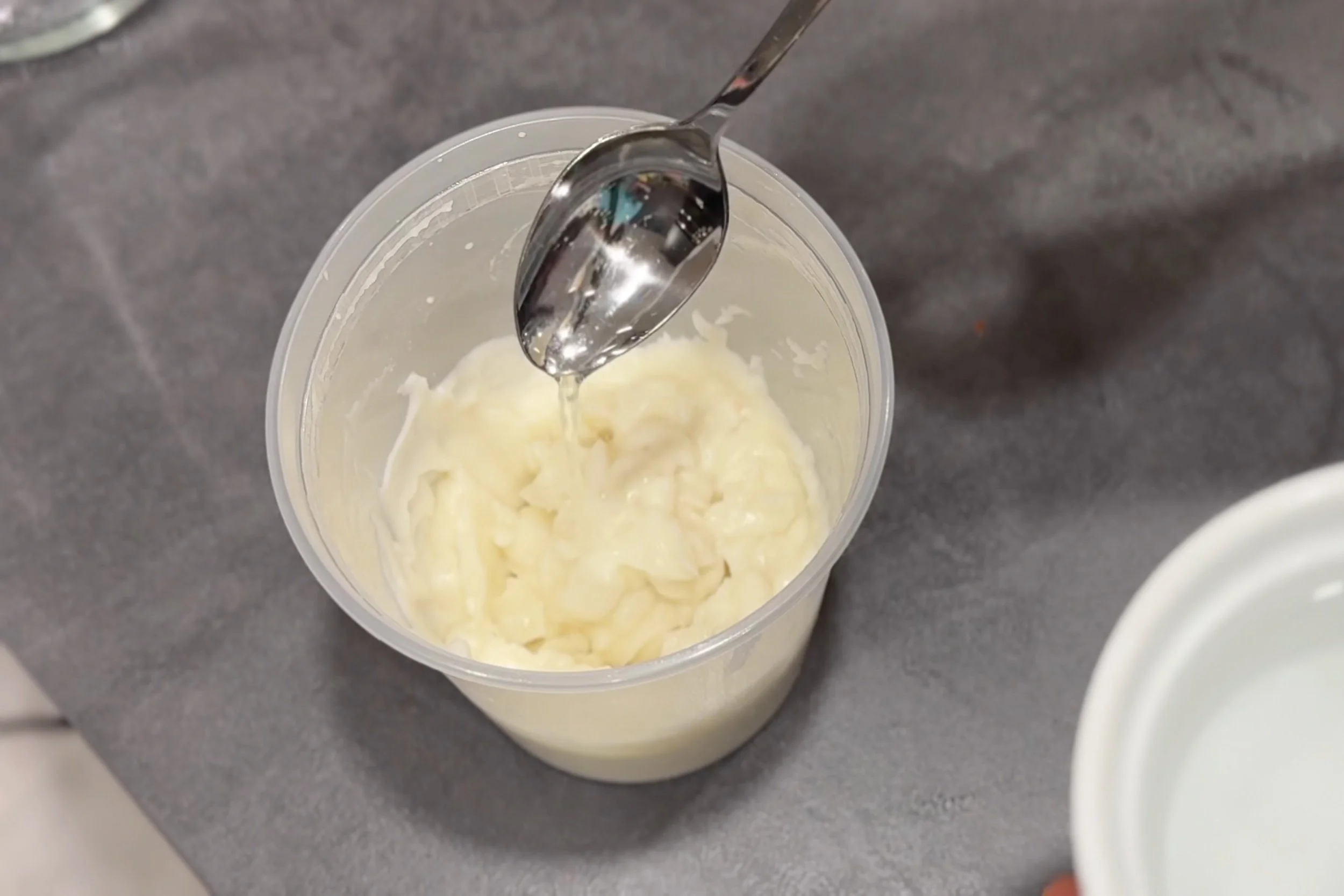 It depends on what happened to you. Firstly, if it split, then you probably just want to discard it, since it’s not usable. If it’s too thin, then you can try to just keep emulsifying. You’ll see soon that the key that was a game changer for me to make it fluffy was… the VESSEL in which I emulsified! You want to use a wide base bowl or container when using an immersion blender so that there’s enough room to blend and make the mixture fluffy. Look at my picture guide or video to see what container I used.