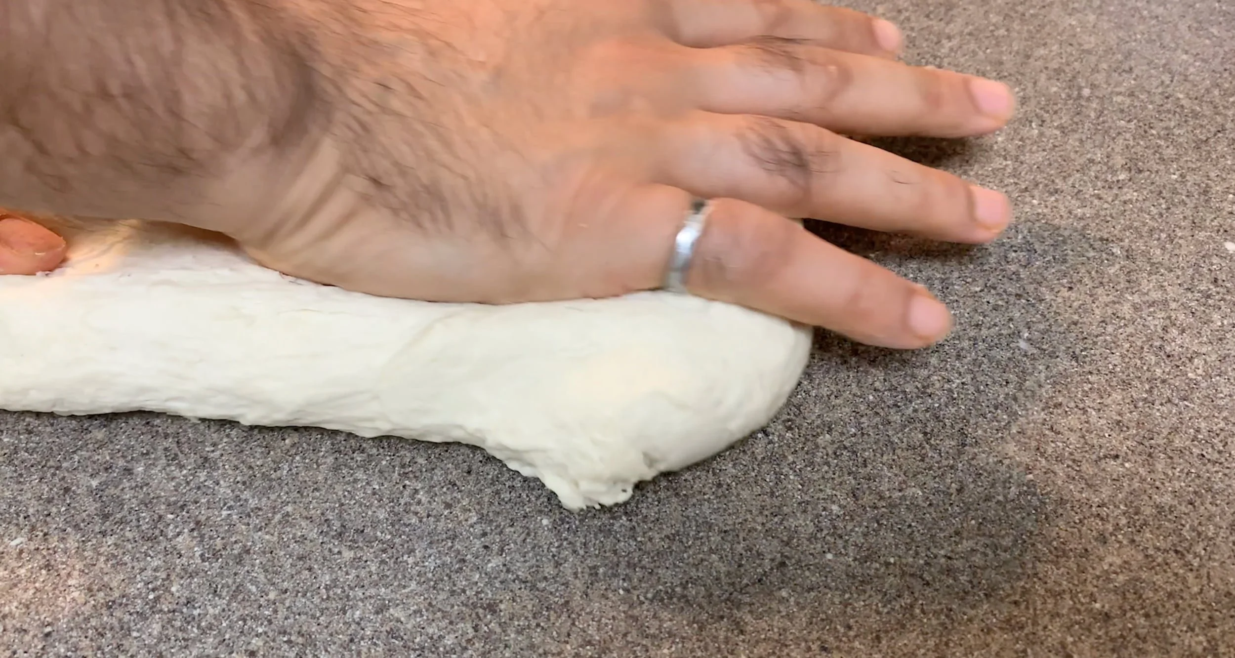 - Transfer the dough to your kitchen countertop and start to stretch and fold the dough. Hold the dough firmly with your non dominant hand, while using the back of your palm to stretch the top part of the dough. Fold the dough on itself, rotate it 45 degrees and continue for about 1 minute.