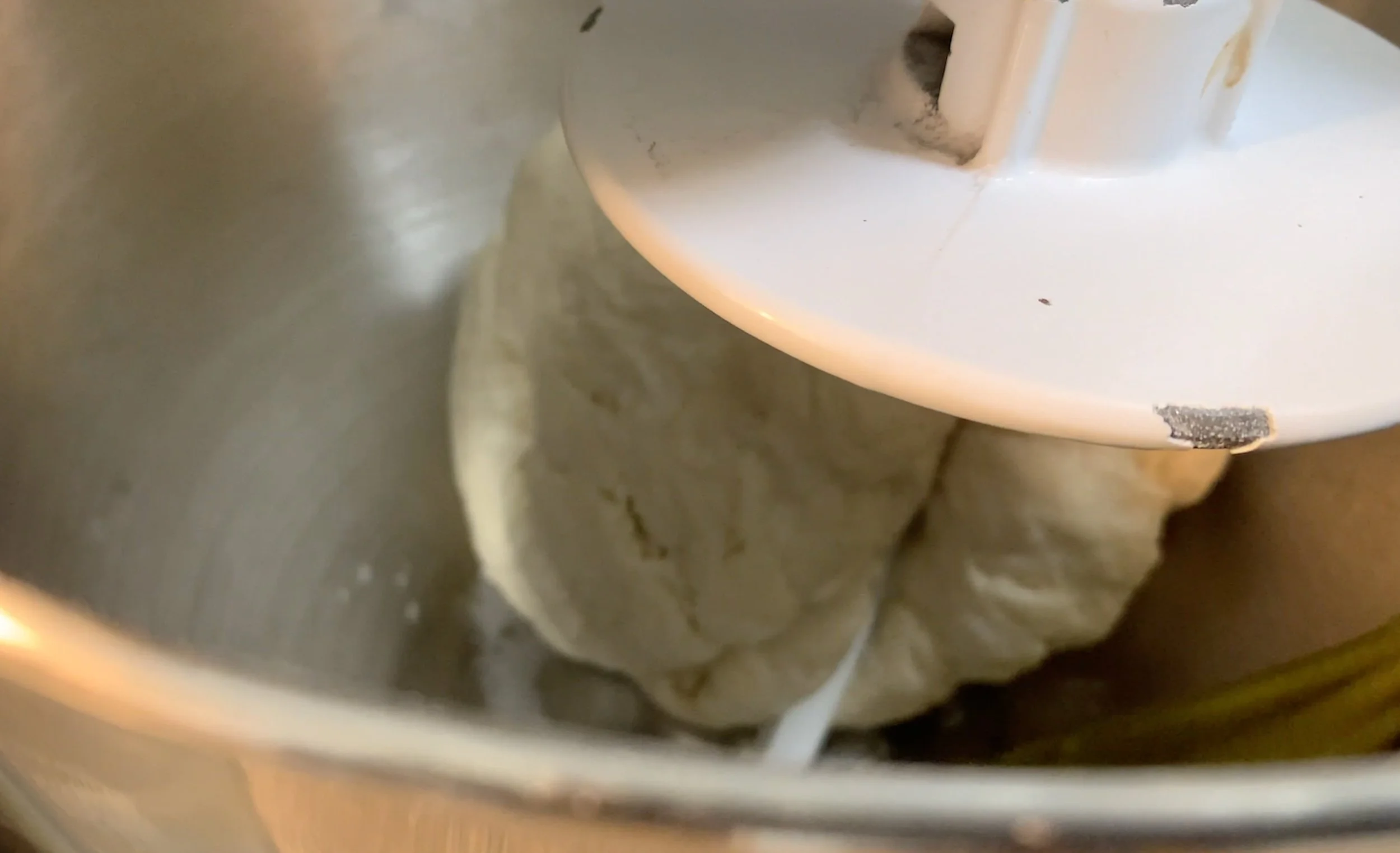 Stop the mixer/kneading, add oil and continue kneading for 1 minute.