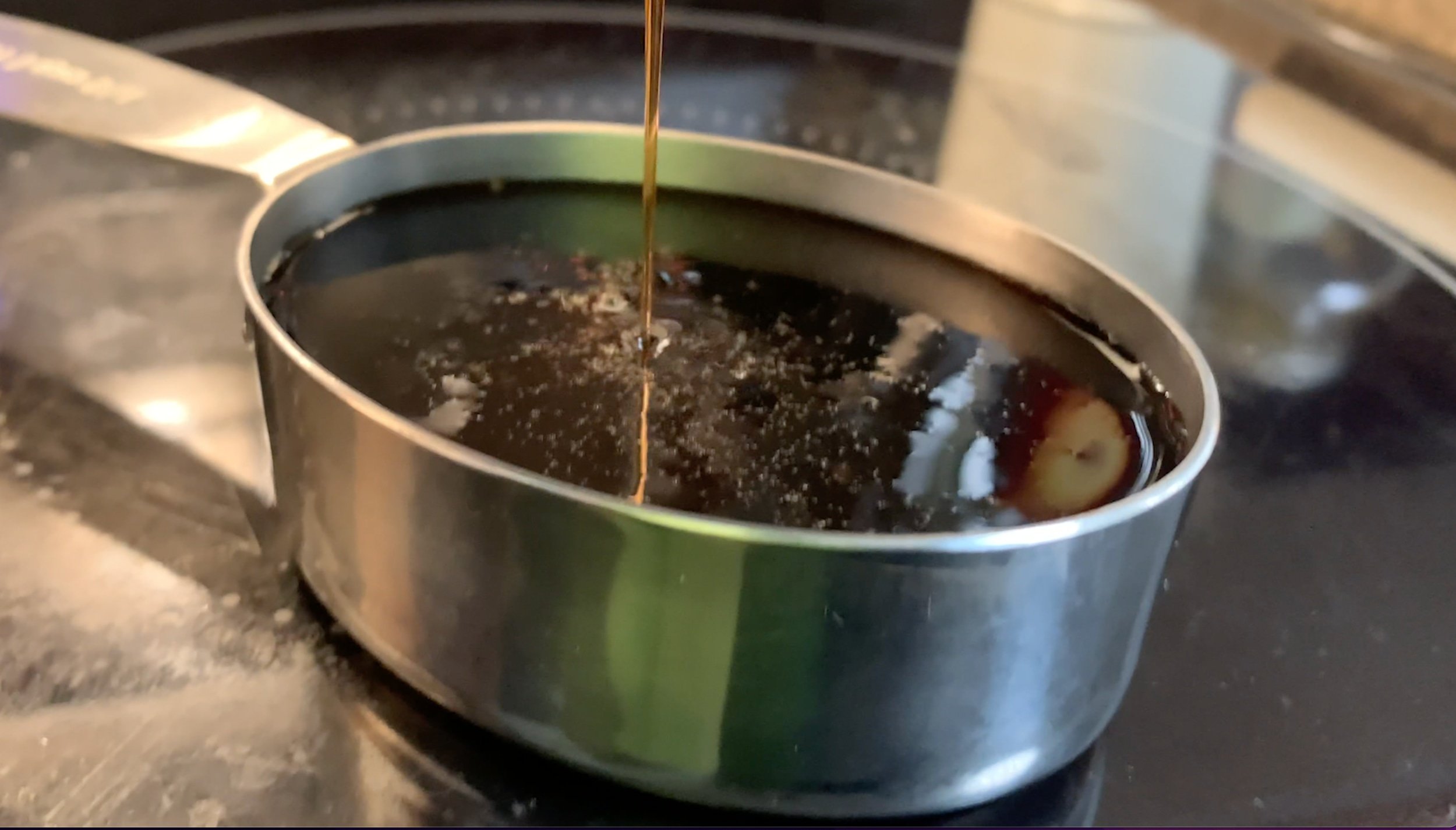 Because the pomegranate juice is warm and hot, it is runnier than it looks. When it cools down, it will become thicker than honey and it will be dense. It will reduce by a factor of 4.