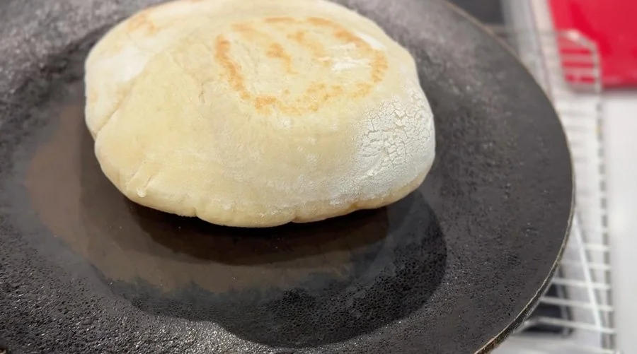 In the meanwhile heat a cast iron pan on medium to medium high heat until its lightly smoking and then place the rolled out dough on the pan. The bread will start to slowly puff up, monitor the underside of the bread and once that side is lightly browned, flip and do the same on the other side.