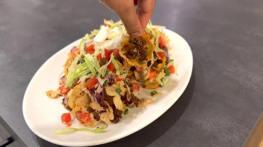 The art of layering nachos can be compared to layering a lasagna. Every layer needs to be loaded with goodness, and in this case, the cheeseburger mixture! With that being said, we’ll add the meat first, followed by the cheese, followed by more nachos, and repeat. We’re utilizing the cheese as a glue to ensure that the toppings don’t just slide off when you’re actually eating the nachos. Additionally, make sure to leave the sauces for garnish at the very end to complete your layered nachos!