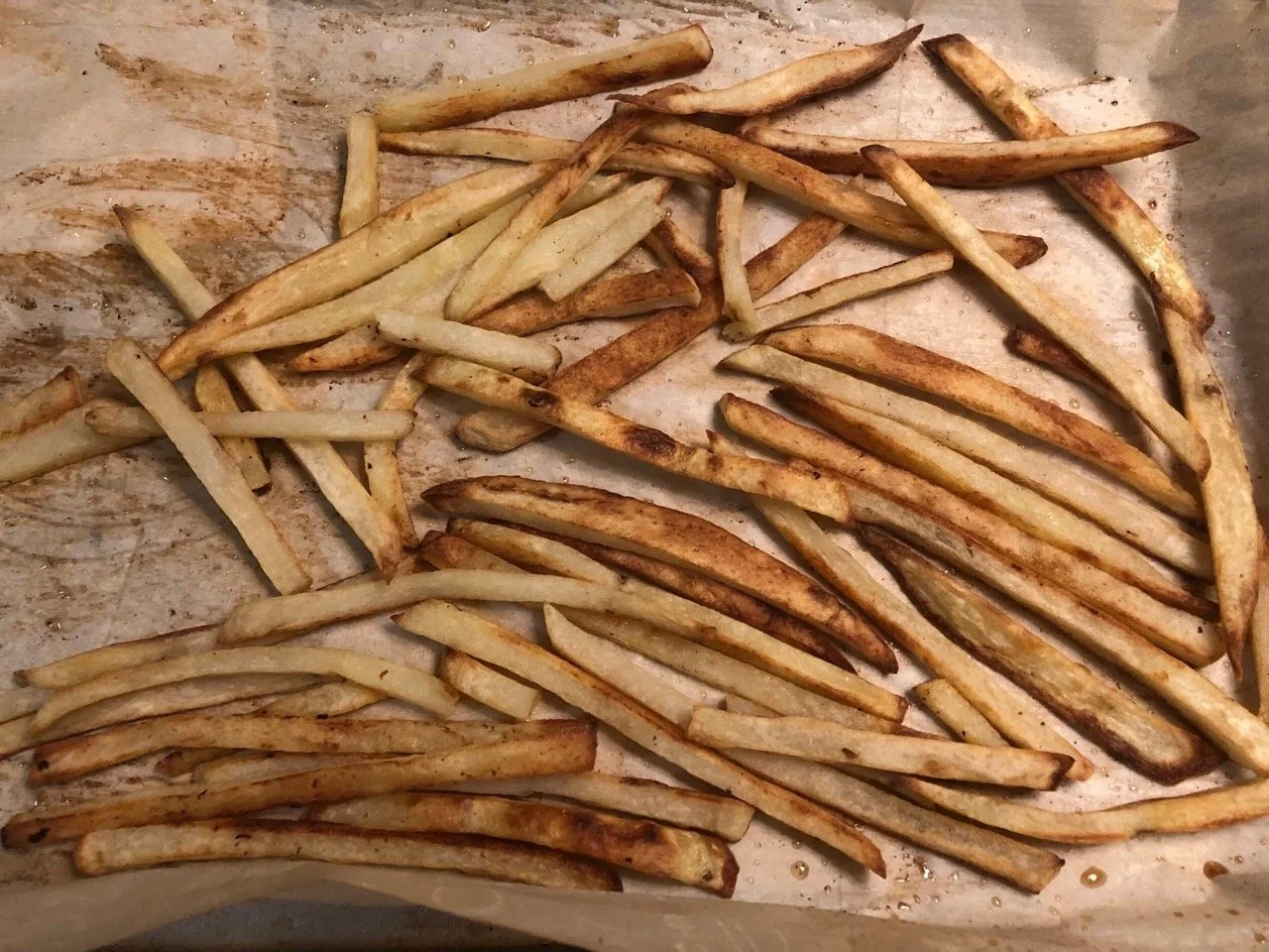 - Transfer fries to a large enough bowl and season with salt and olive oil. Layer a large baking tray with parchment paper and place the fries on it. Bake the fries on the middle rack for 20 minutes or until they are light golden brown