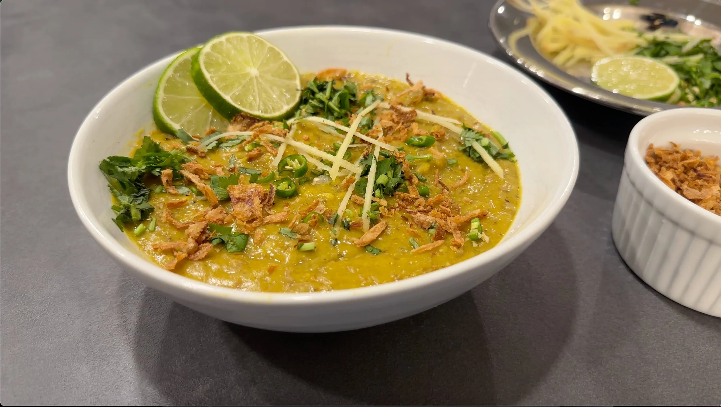 Haleem is a thick and rich savoury porridge-like dish. We mix in lentils, wheat, and rice along with sauteed shredded meat. The best way for me to describe Haleem is like the Indian Khichdi but with added meat.