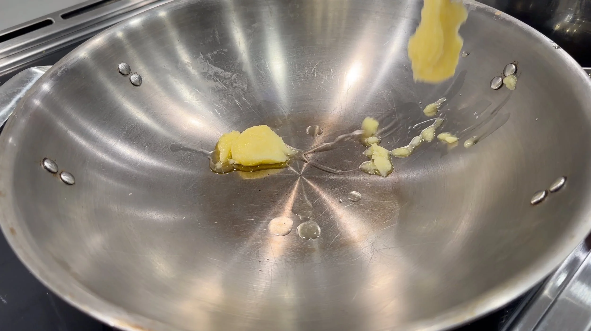 Toss well and rub the spice thoroughly. Heat a wok/kadai on medium heat and once hot, add the ghee.