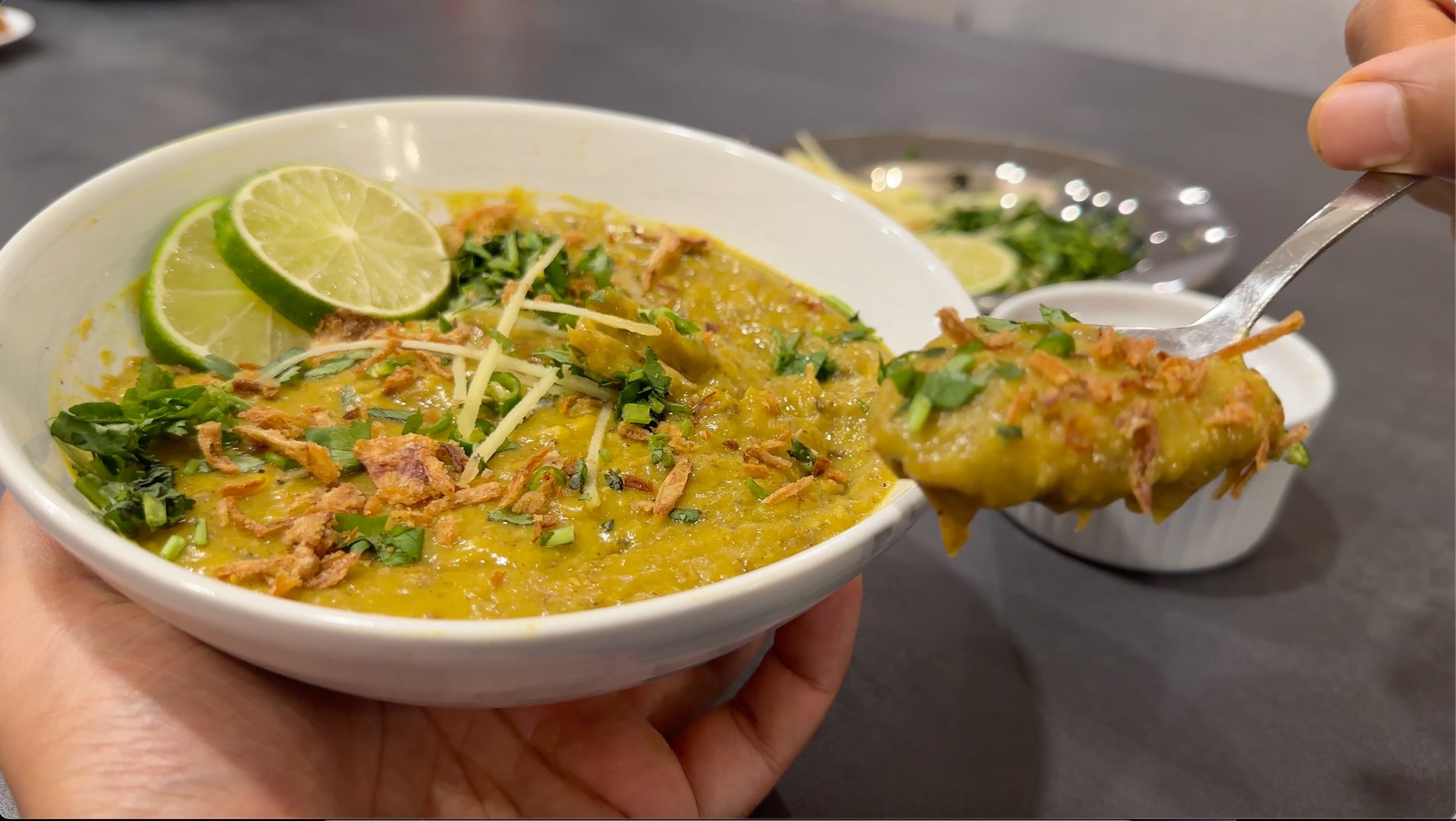 Haleem is just a hearty meat stew, as mentioned above! It’s got so much going on, but everything works together because it’s mish-mashed together. You’ll have some heat and complex flavours from the spices and garnish on top, and you’ll enjoy wonderfully shredded and tender meat. The final product you’re looking for is smooth, with just the strands of meat being visible. These strands of meat are called the resha. Essentially, think of haleem as a savoury porridge.