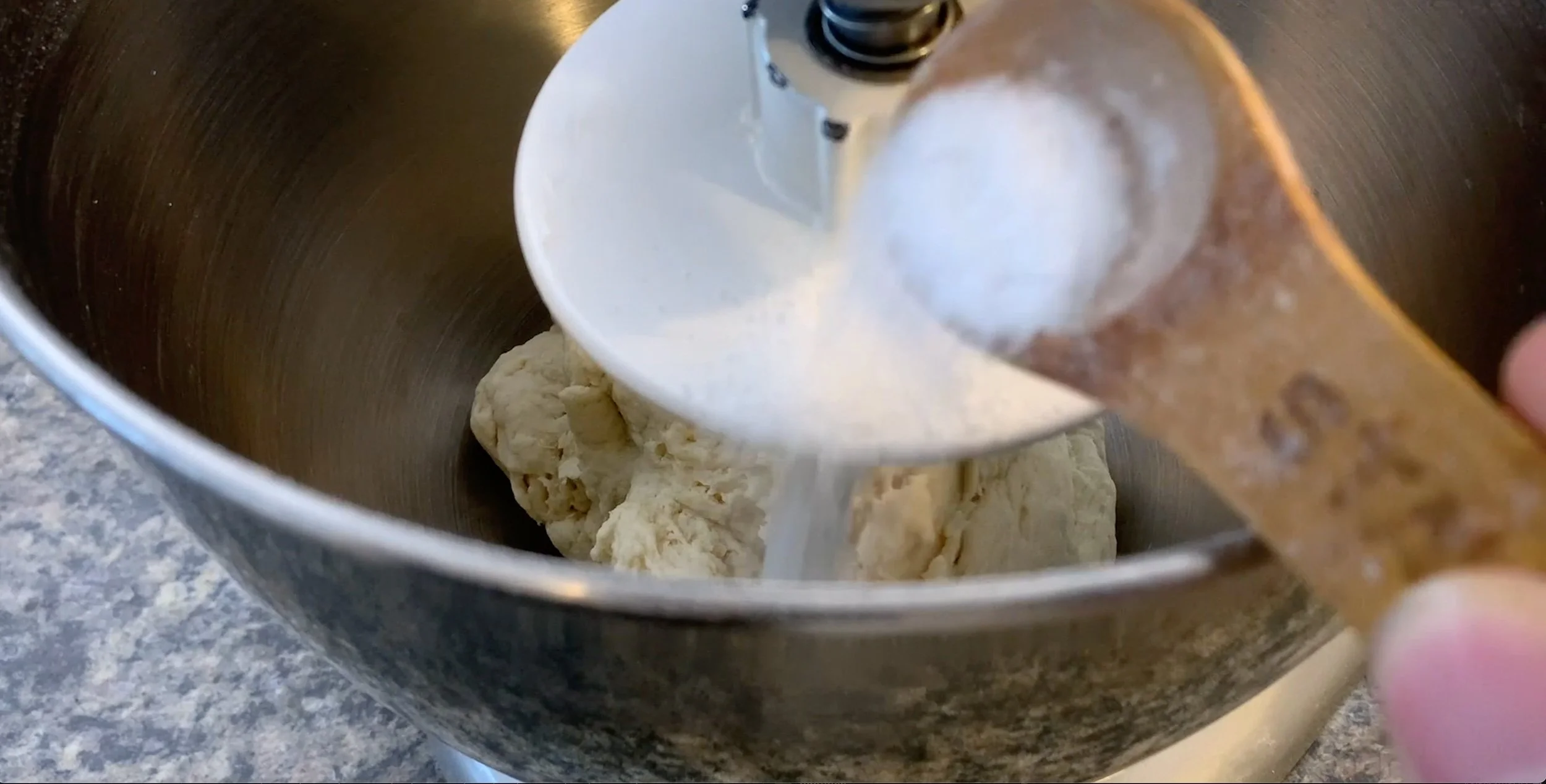 Stop the mixer and add the salt. Knead on low speed for 1 minute.