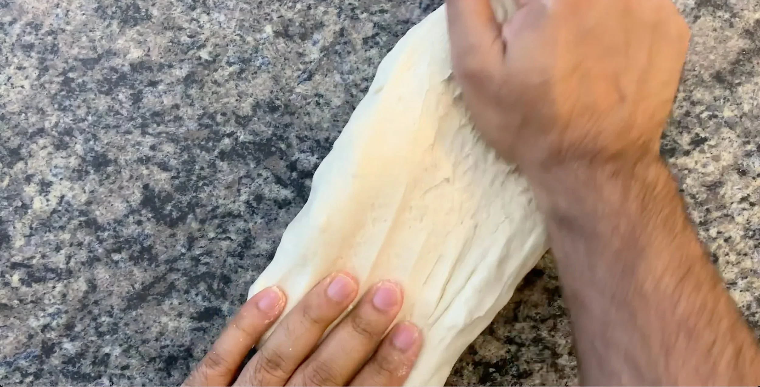 - Then, transfer the dough to your countertop and continue kneading, stretch and fold the dough for 1-2 minutes. Or until, the dough is soft, and has no creases or lines.