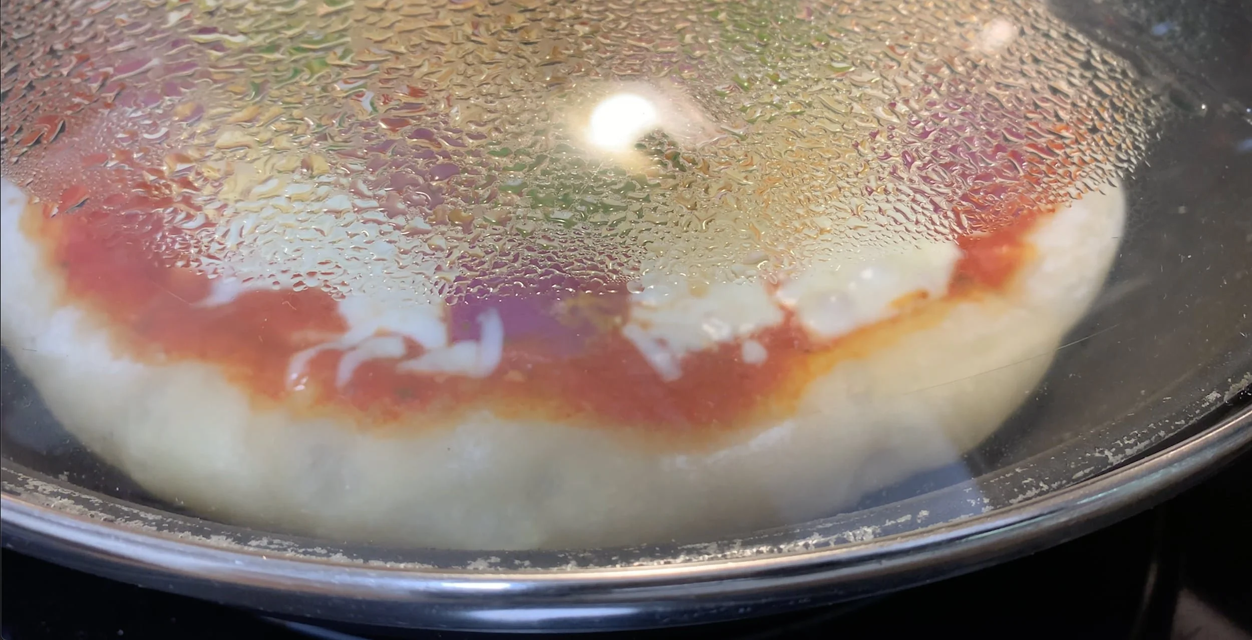 - Once you see a light brown crust, turn the heat all the way to low and cover the pan with a lid. The dough at the edges and the toppings will finish cooking with the steam within the pan.