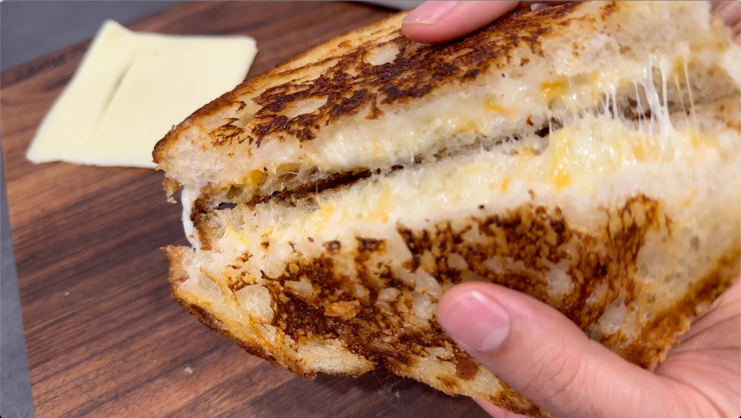 It may come as a surprise to you, but a lot of the sandwich cheese pulls you see on social media platforms are faked. Essentially, this is how it works. You make the sandwich as usual and cut it at a diagonal. Then, you open it up, add a slice of cheese that gets great pulls and warm the sandwich in the pan again.