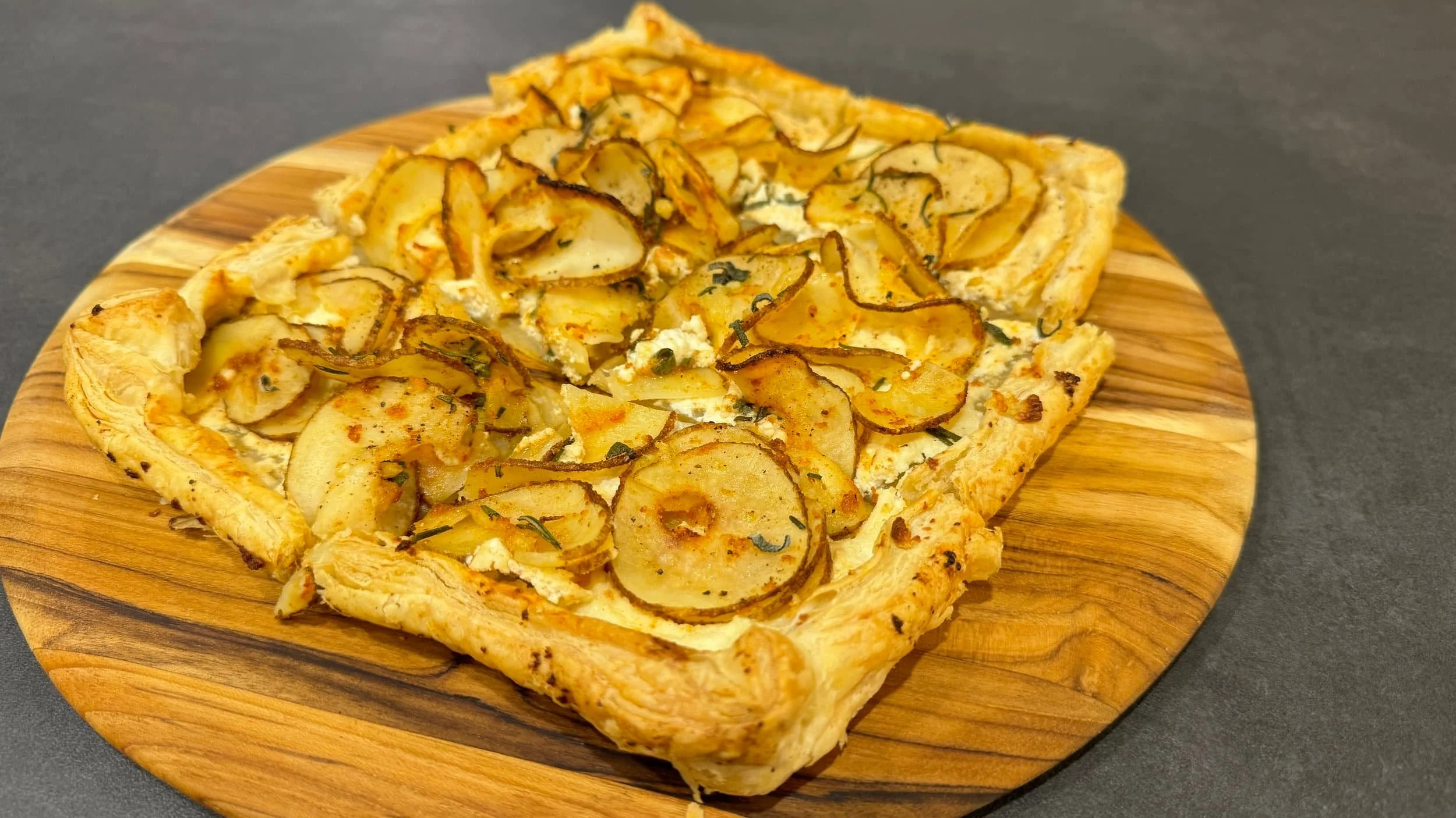 - Bake for 25-35 minutes, or until the potatoes are cooked with some crispy edges and the pastry is golden brown. Let the tart cool down for 10-15 minutes before serving.
