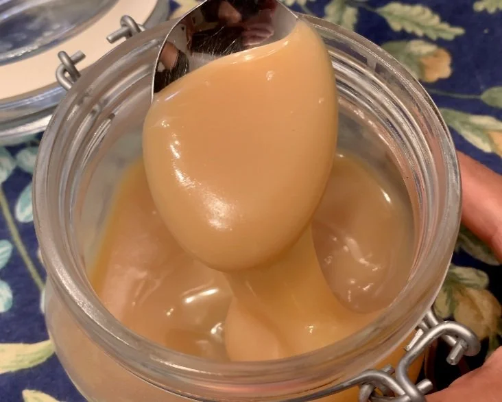 The mixture should be thick and smooth. The colour before adding the coffee or vanilla should be a rich toffee like colour, light brown and the entire sauce should have a sheen.
