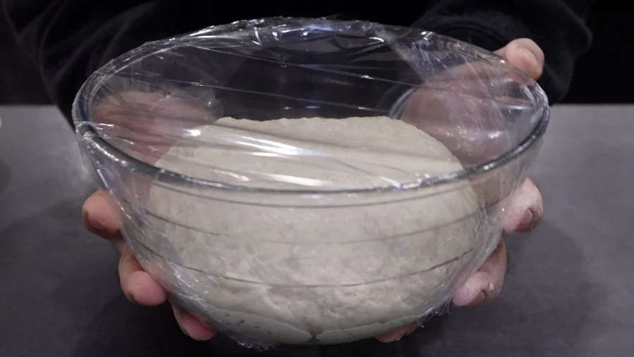 - In a large mixing bowl, combine flour and salt. Gradually add the water mixture and stir with a wooden spoon or hand until a sticky dough forms.