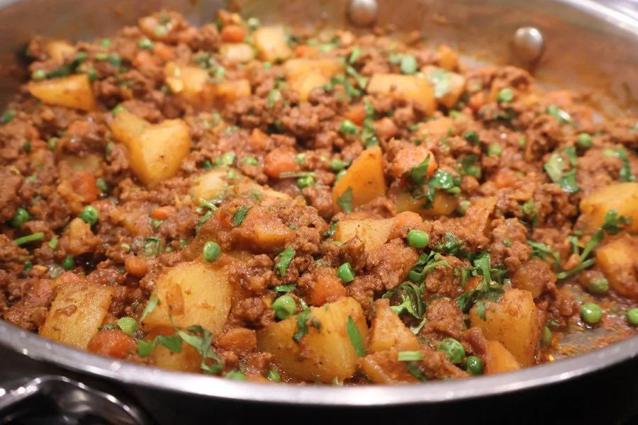 - Add ground beef, curry powder, turmeric, cinnamon, cardamom, ground cumin, and chili powder. Mix well and cook until browned, breaking up the mince with a spoon.