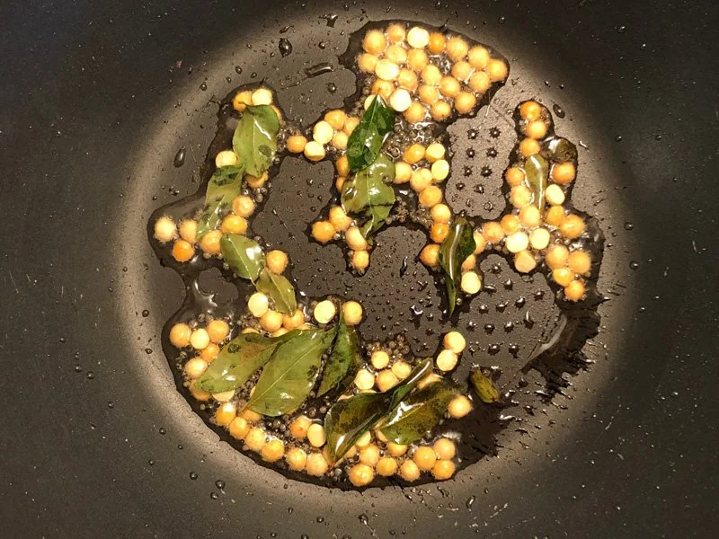 - In the same pan, heat oil on medium heat and add mustard seeds and curry leaves. When the mustard seeds start to pop, add the chana dal/split chickpea lentils.