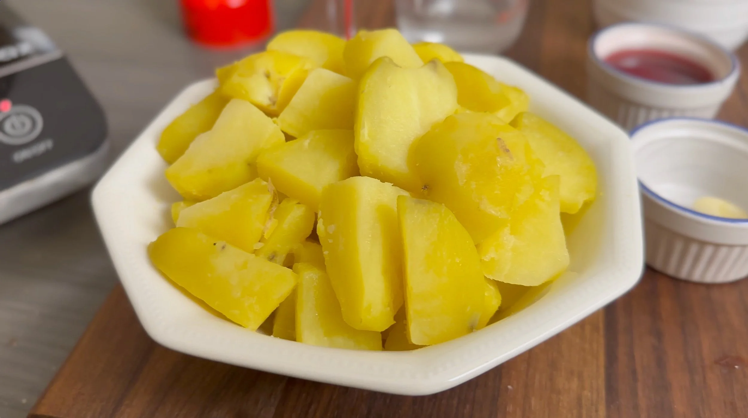 Instead of boiling or steaming to cook the potatoes, you can choose to fry the potatoes at 125 C. Just remember, at this point, we only want to cook the potatoes, not make them crispy.