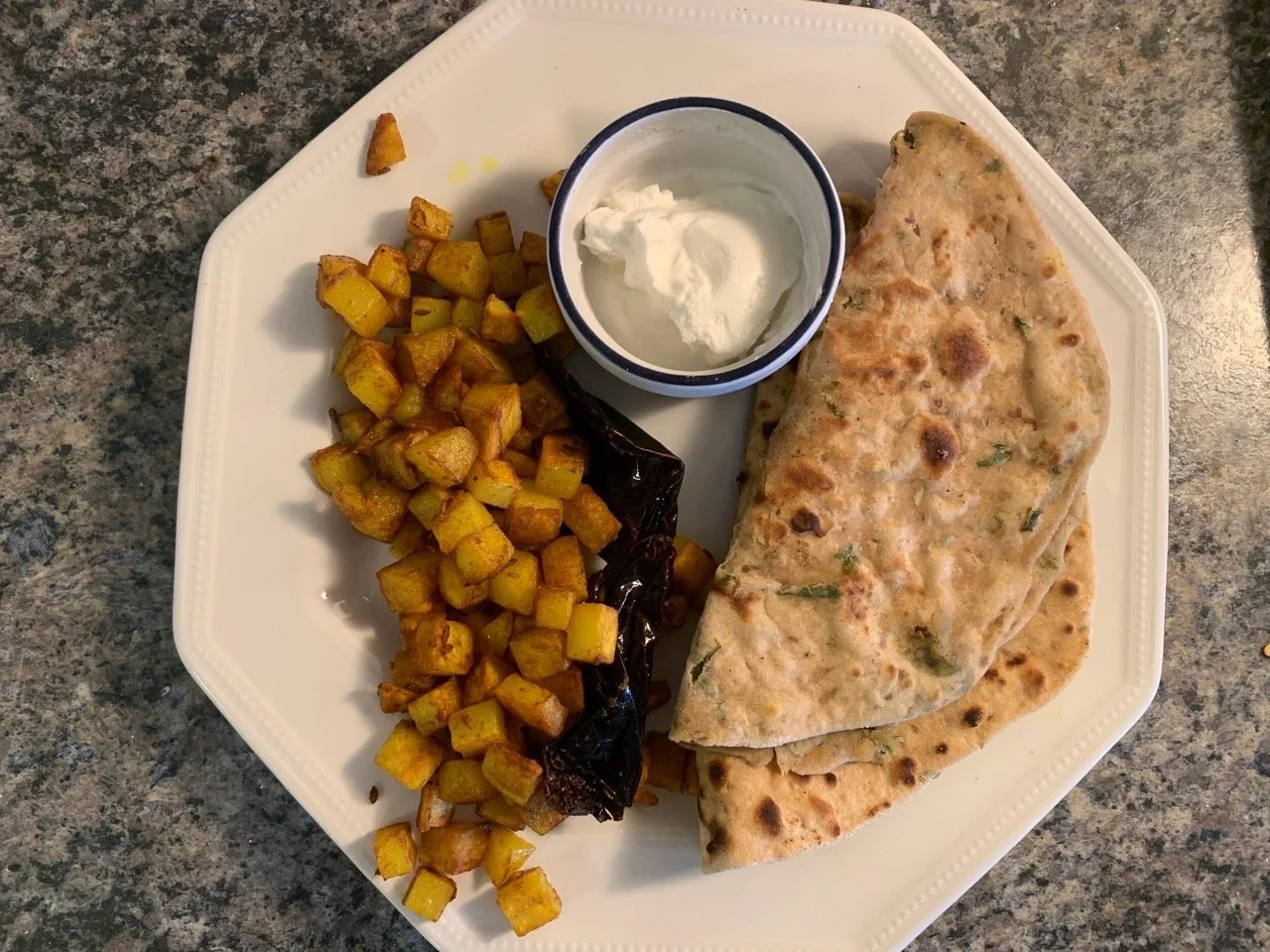 Of course you could enjoy these delicious Hari Mirch Parathas on their own with a side of yogurt to cool off and that would be an awesome breakfast! However, for a more satisfying meal, feel free to pair with your favourite sabji! In this photo, I enjoyed the parathas with some Crispy Aloo Bhujia - a North Indian-style potato stir fry! This lunch was superb!